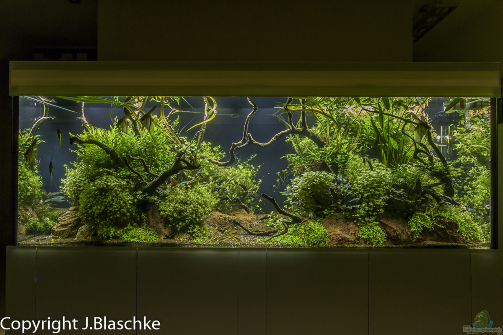 Sonderanfertigung der Firmen Aquariumbau Graf / Aquarium West München; Front- und Seitenscheiben in Wei??glas 15mm, Schwarzglasschacht hinten rechts (38 cm lang x 13 cm tief) mit - 4 Bohrungen für 2x Filterabläufe/-zuläufe, - 2 Bohrungen für Wasserüberlauf, Alu-Rahmen-Unterbau; Verkleidung des Unterbaus mit wei?? lackiertem Glas; Zeitgesteuerter Zulauf von Roh- und Osmosewasser (Durchlaufbecken),