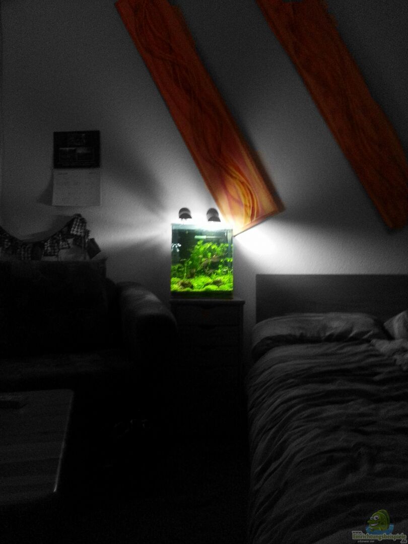 Die Vorrichtung des Hamburgermattenfilter ist mit Schieferstückchen beklebt. Die selbstgebaute Schieferrückwand ist ebenfalls fest eingeklebt. Die Seiten der Rückwand sind nicht komplett geschlossen. So haben die Garnelen die möglichkeit sich dahinter zu verstecken. An dieser Stelle gab es schon interessante Beobachtungen. Mittlerweile sucht hat auch die Wasserpest die Lücken entdeckt und wächst fröhlich dahinter weiter.