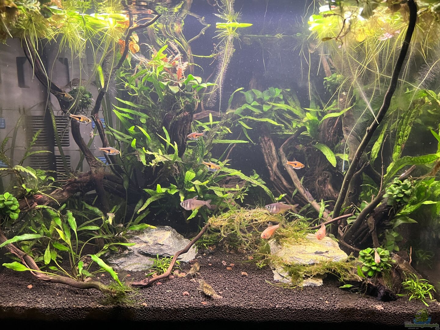Weissglas-Becken von Dennerle (Nano Tank 70l) wird ohne GlasAbdeckung betrieben, das Holz-Hardscape (Wurzel) von Amtra Dragon Skin steht oben einige cm heraus. Als Schattenspender dient eine Schwimmpflanzendecke Schwarze selbstklebende Rückwandfolie Die Einrichtung selbst wurde nicht mit Fotos begleitet, da mein erstes Becken