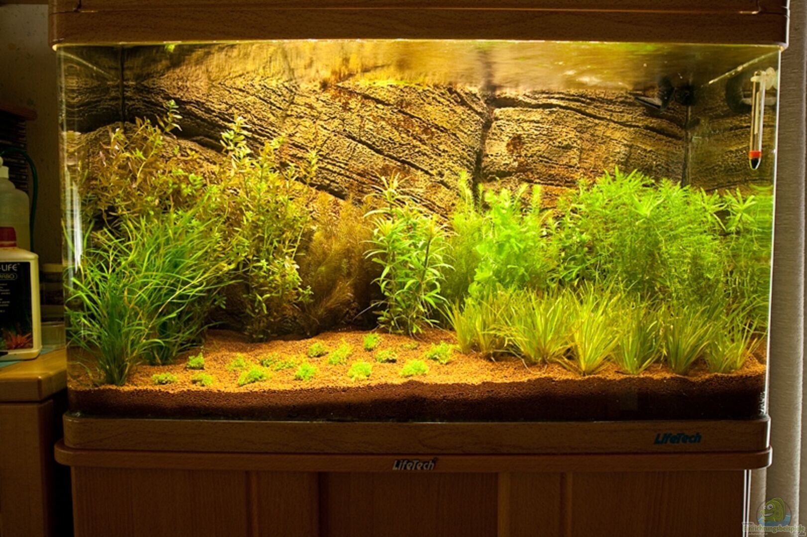 Aquarium ist von LifeTech, mit passender Abdeckung und passendem Unterschrank aus Eiche. Die Frontscheibe und die Seitenscheiben sind ein Element.