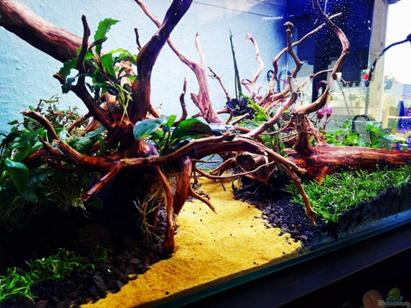 Dieses ist ein Blau "Cubic Nano"Aquarium. Es hat abgerundete Kanten im vorderen Bereich. Diese sorgen für eine schöne Frontalansicht. Das Aquarium wurde im Wohnzimmer auf einem Sideboard aufgestellt.