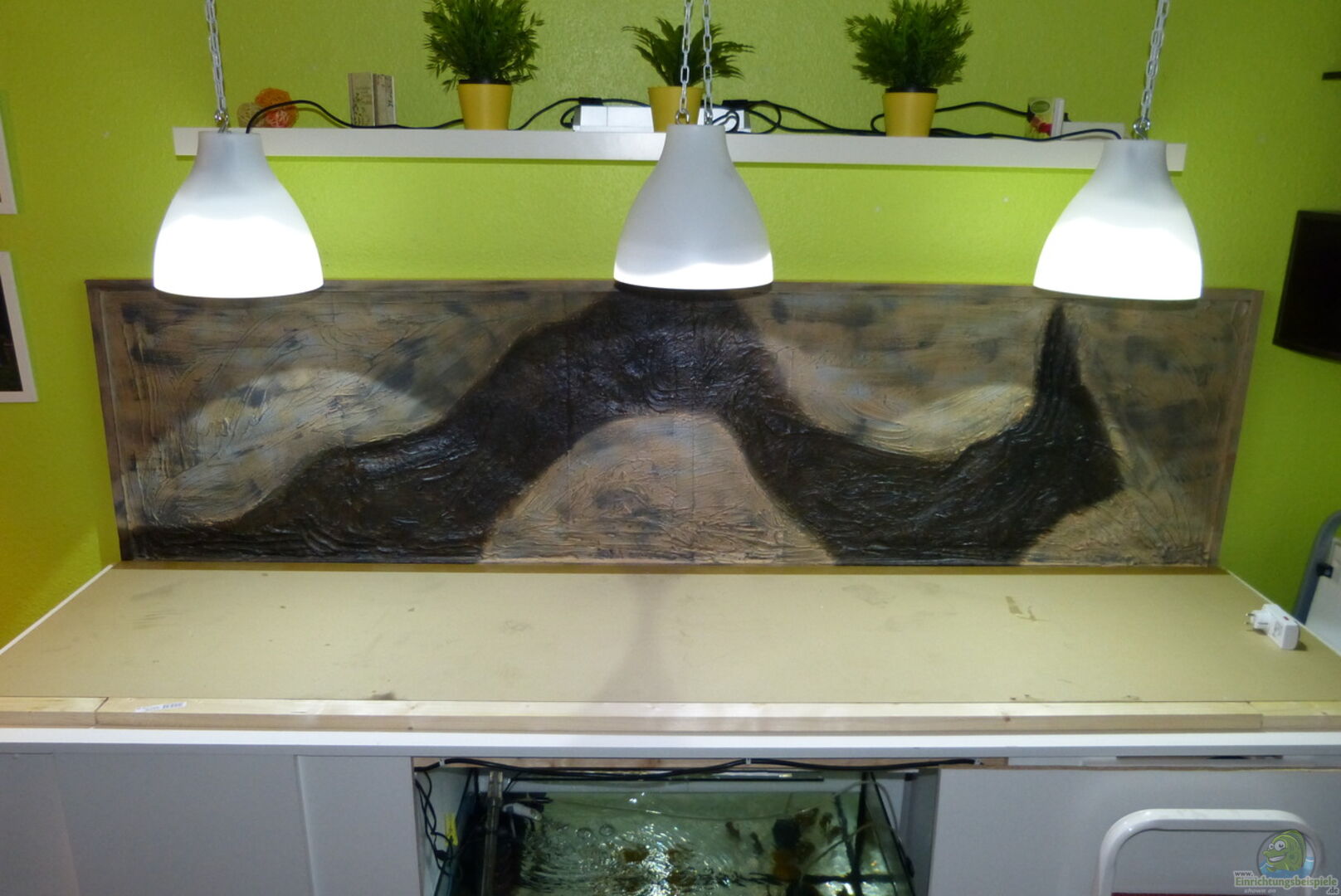 - selbstgebaute Rückwand in Stein/Felsoptik au??erhalb des Beckens - Moorkienwurzeln in verschieden Grö??en von XL - XXXL - Korkenzieherhaselnussäste von oben ins Becken gehangen - künstliche Terrarien Pflanzen von Exo Terra * 2 x Exo Terra Ficus (ca.70cm) * 2 x Exo Terra Ficus (ca.45cm) - Seemandelbaumblätter - Erlenzapfen * Die Seemandelbaumblätter werden alle 2 Wochen ausgetauscht und von den Erlenzapfen wird wöchentlich etwas selbstgemachter Tee ins Becken [...]