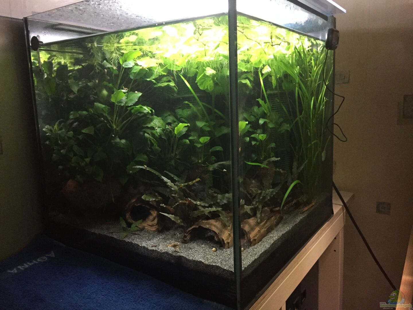 Es handelt sich um ein Standardaquarium ohne Besonderheiten. Die Abdeckung besteht aus einer Plexiglasplatte, die im Zweifel einen Fluchtversuch der Frösche aufhalten soll. Ursprünglich war dies mein Quarantänebecken und die ersten Bewohner, die in Quarantäne gekommen sind, sind sogleich drin geblieben :-D ... also ade Quarantänebecken