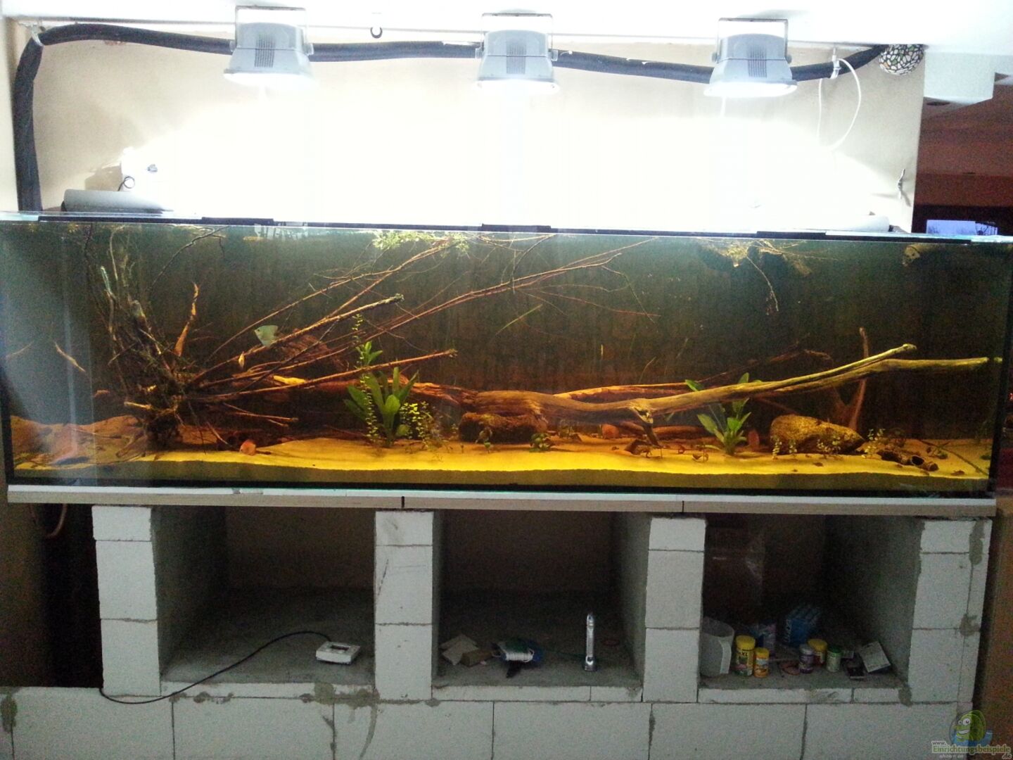 Gefertigt aus 15 mm Glas, zweigeteilte Bodenplatte, Sto??verklebt, geklebt geliefert, 3 Zugstreben, Strebe zusätzlich auf die Bodenplattennaht geklebt. Alle Streben aus 12mm Glas. Hinten links ein ??berlaufschacht mit zwei Bohrungen (55 und 45 mm) als Ablauf. Wasserstand des Beckens ca. mittig Stabistreben, kurz unter den Zugstreben. 6 Personen hatten alle Hände voll zu tun, den Tank unbeschadet durchs Fenster zu hieven. 10 Minuten Arbeit und 2 Frühstückspause danach :-) Unterbau [...]