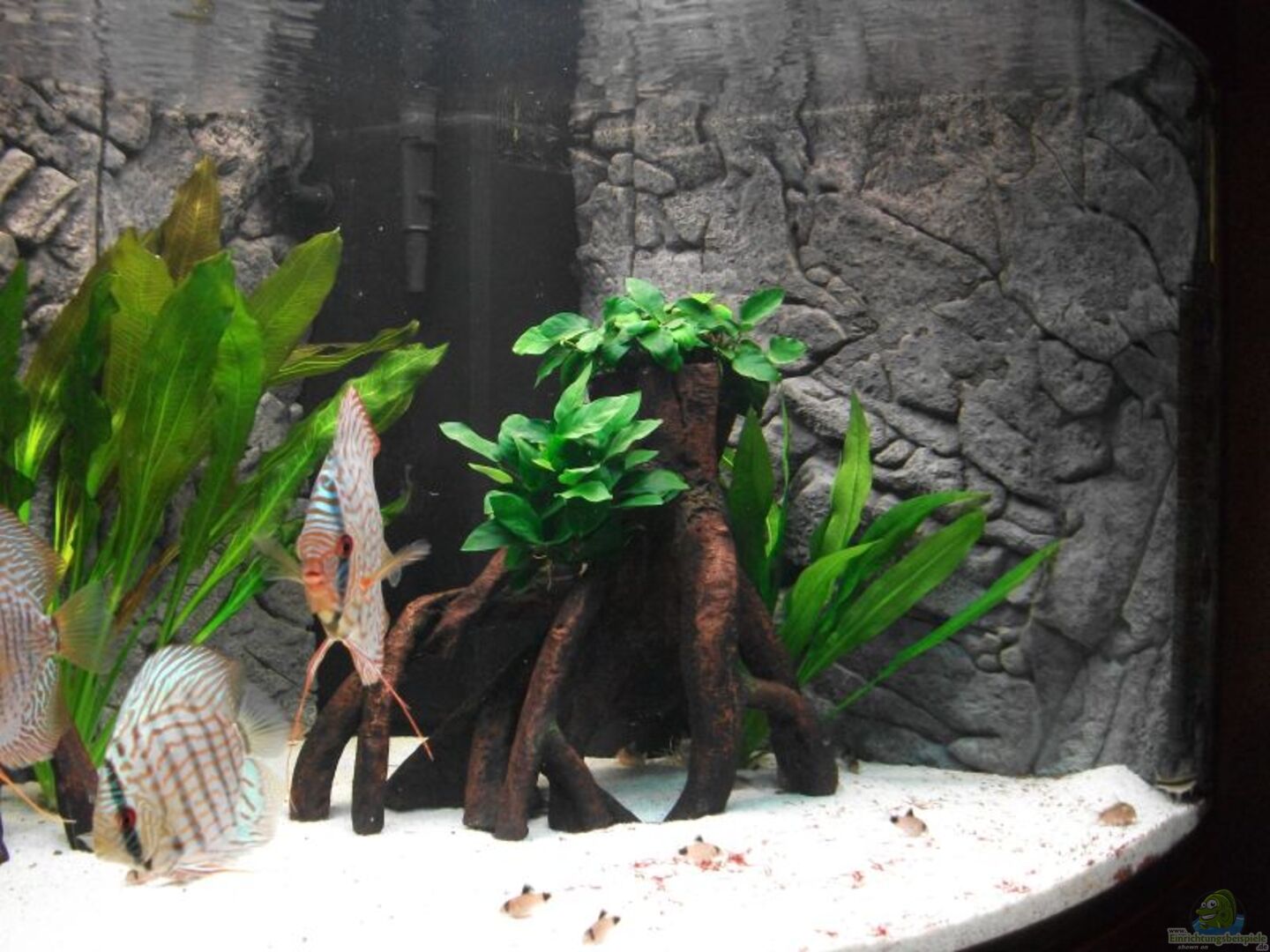 Bei dem Becken handelt es sich um ein Eckaquarium von der Firma Aquatec Pausa mit Abdeckung und Unterschrank. Das Becken hat eine runde Frontscheibe (1/4-Kreis) und ein Volumen von 350 Liter