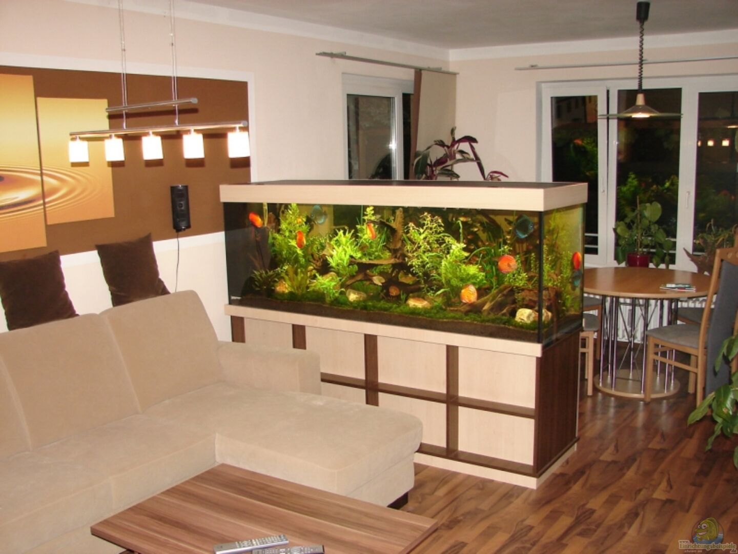 Das Becken ist als Raumteiler im Wohnzimmer aufgestellt. Es befinden sich an der linken Stirnseite, zur Wand hin, 2 Bohrungen mit 28mm Durchmesser und Tankverschraubungen für 20mm PVC-Rohre.