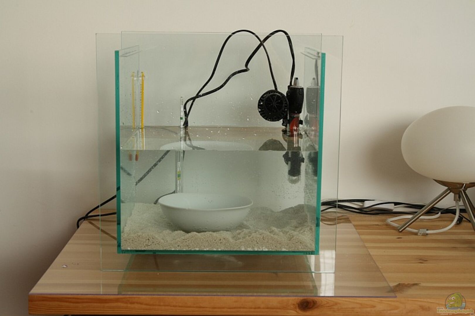 Seiten- und Bodenscheibe sind zwischen die Front- und Rückscheibe "schwebend" eingeklebt, so steht das Ganze nur auf der Front- und Rückscheibe. Dabei wurde so wenig Silikon wie möglich eingesetzt, damit nur die Scheiben in der Ansicht wirken.