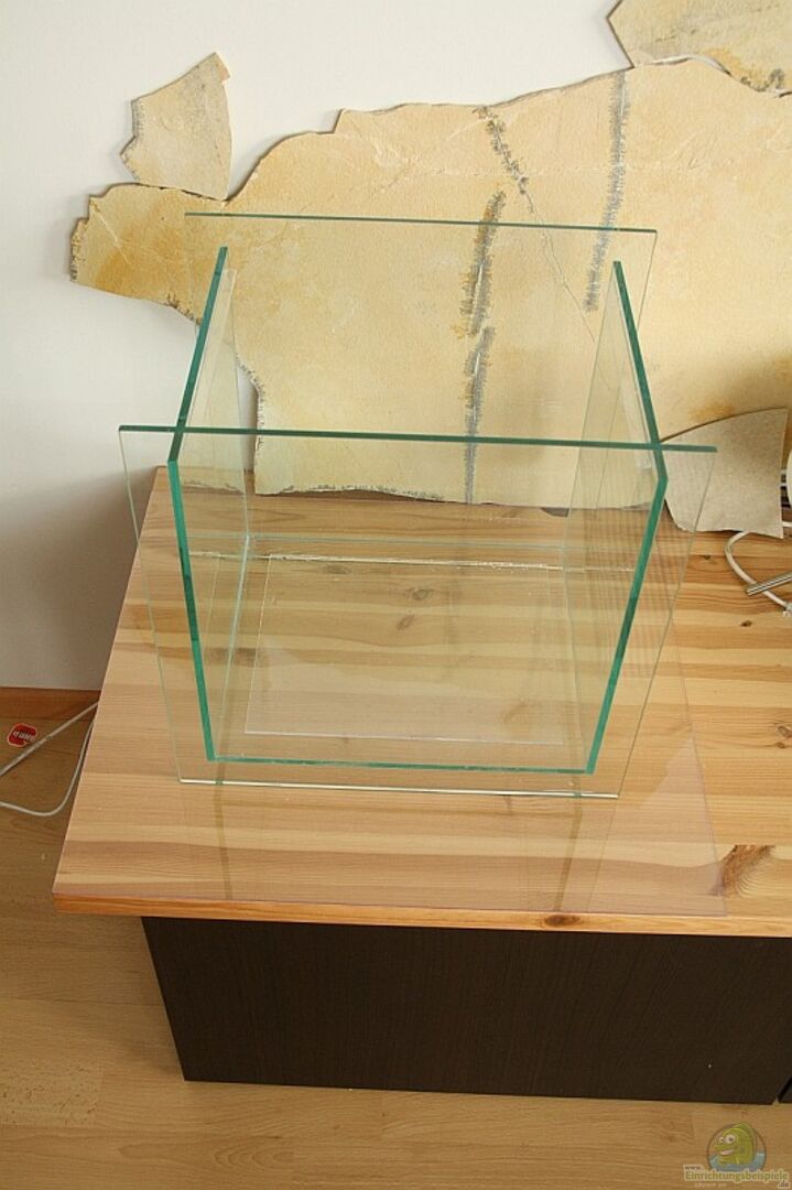 Seiten- und Bodenscheibe sind zwischen die Front- und Rückscheibe "schwebend" eingeklebt, so steht das Ganze nur auf der Front- und Rückscheibe. Dabei wurde so wenig Silikon wie möglich eingesetzt, damit nur die Scheiben in der Ansicht wirken.