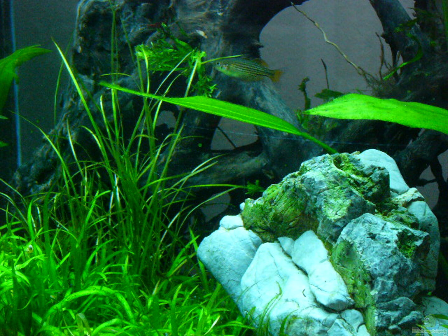 An der Hinterseite ist eine grosse Holzwurzel (ca. B70, H50, T8cm)angebracht, die mit dem Kongo Wasserfarn und Javafarn bepflanzt ist.