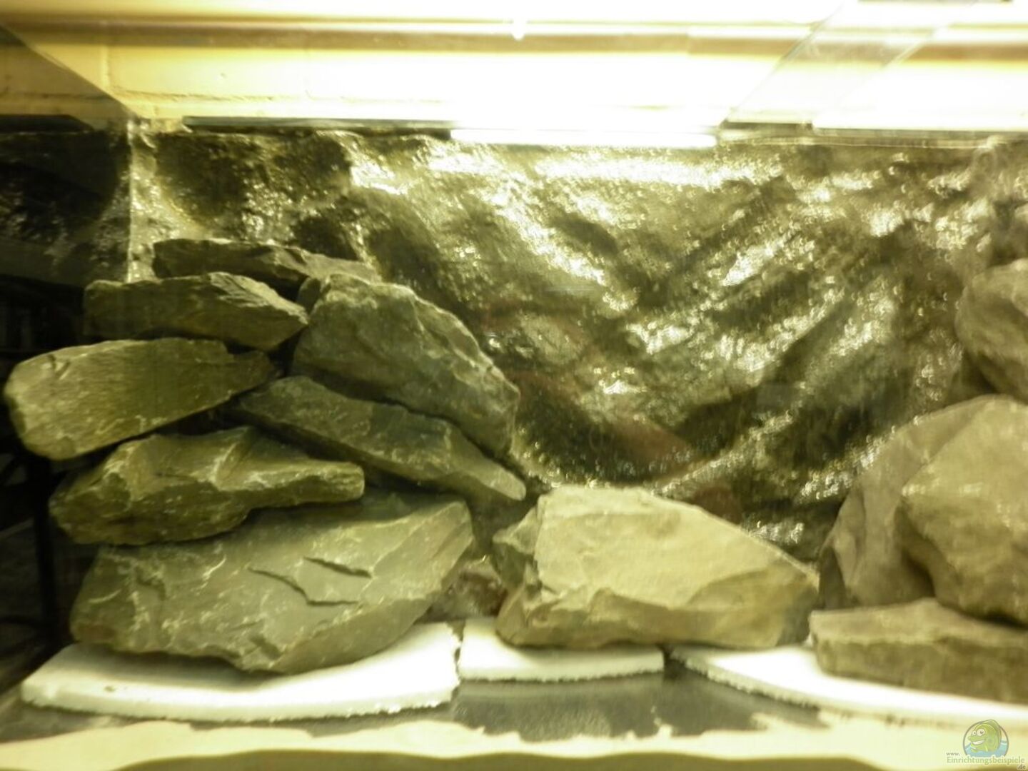 Rückwand: Eigenbau, genaueres bei Tanganjika ??bergangszone Steine: ca.100Kg ``graue Wacke`` von der Schurenbachhalde in Altenessen (graue Wacke nennt die mein Opa der die seiner zeit aus der zechengrube geholt hat) Sonstiges: Weinbergschneckenhäuser, für den Anfang ca. 30-50. Ich werde noch einige nachlegen müssen, wenn die Callipterus sich die gegenseitig klauen.