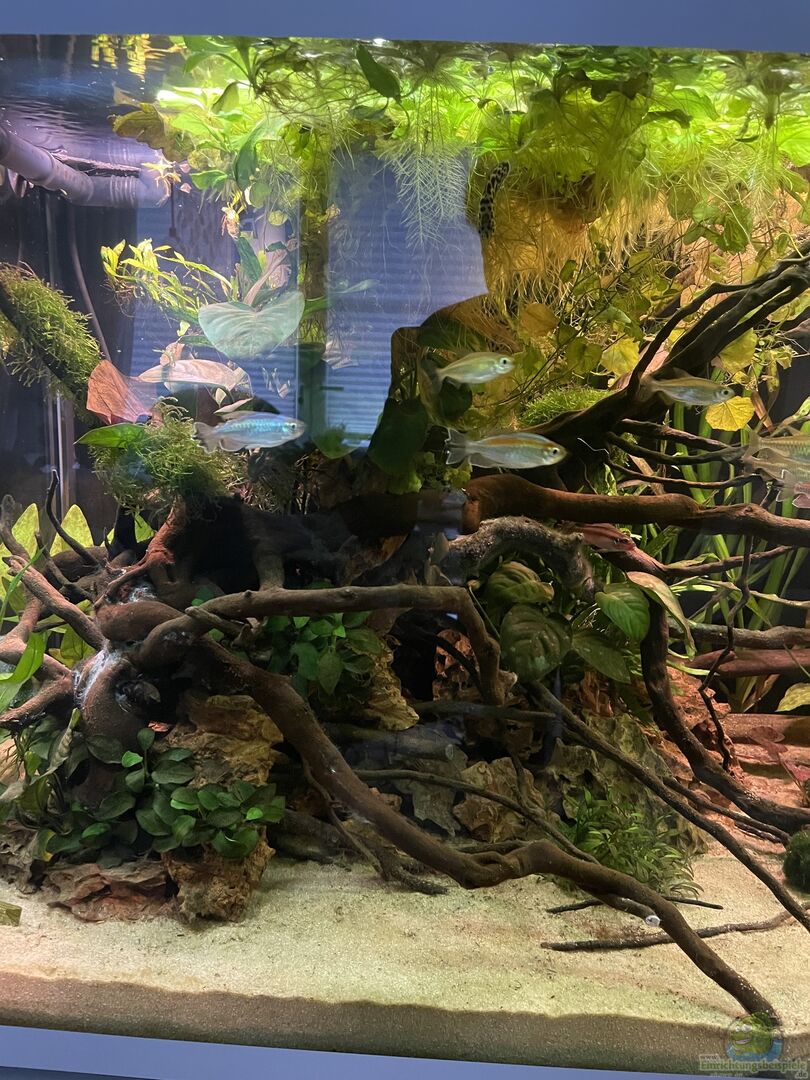 Steinaufbau aus Drachensteinen und massig Wurzelholz (hauptsächlich Moorkien). Die Steine sind mit verschiedenen Anubien bepflanzt, die Moorkien mit Javamoos. Die übrig gebliebenen Bruchstücke der Wurzeln habe ich für die Einrichtung genutzt und sie einfach im Becken verteilt. Auf der rechten Seite des Beckens steht eine gro??e Mangrove, bepflanzt mit Kongofarn und Windelov Javafarn. Ein paar Mooskugeln runden das Bild ab.