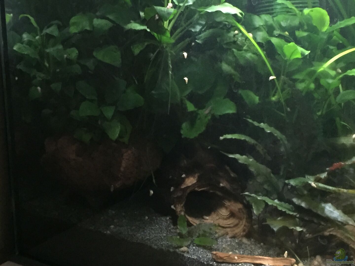 Auf der linken Beckenseite befindet sich ein Steinaufbau aus Lavasteinen. In diesen sind eine Moorkienholzhöhle sowie zwei Keramikhöhlen integriert. Auf den Lavasteinen wurden Anubien befestigt. Der Steinaufbau stellt einen gro??en und vielfältigen Rückzugsort für meinen Besatz dar. Wichtig war mir hier vor allem die Funktionalität und nur bedingt die Optik. Zusätzlich verwende ich Seemandelbaumblätter sowie Eichen- und Buchenlaub, das gerne von den Fröschen als Deckung genutzt wird. [...]
