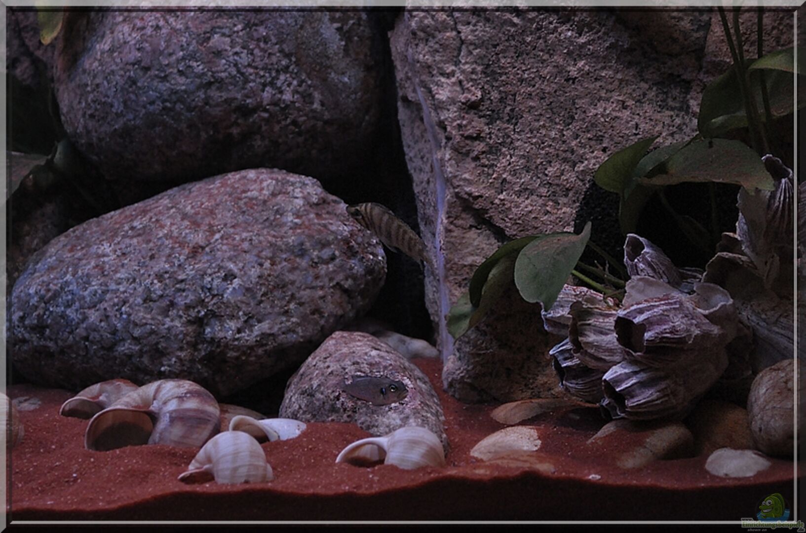 ca. 15kg gesammeltes, gebürstete und abgekochte Flusskieselsteine im Hintergrund aufgebaut mit Spalten/Höhlen, sowie kleine Kieselsteine als Geröll-Ausläufer (hauptsächlich für die Altolamprologus conpressiceps). Alles auf 1cm Styropor zum Schutz des Bodenglases. Verschiedene JUWEL-Slim-Line Module ???Roter Gnei????? an der Rückwand, den Seiten und als Innenfilter-Verkleidung mit zusätzlicher Filtermatte dazwischen. ***** - viele Weinbergschneckenhäuser (derzeit 19 Stück) - [...]