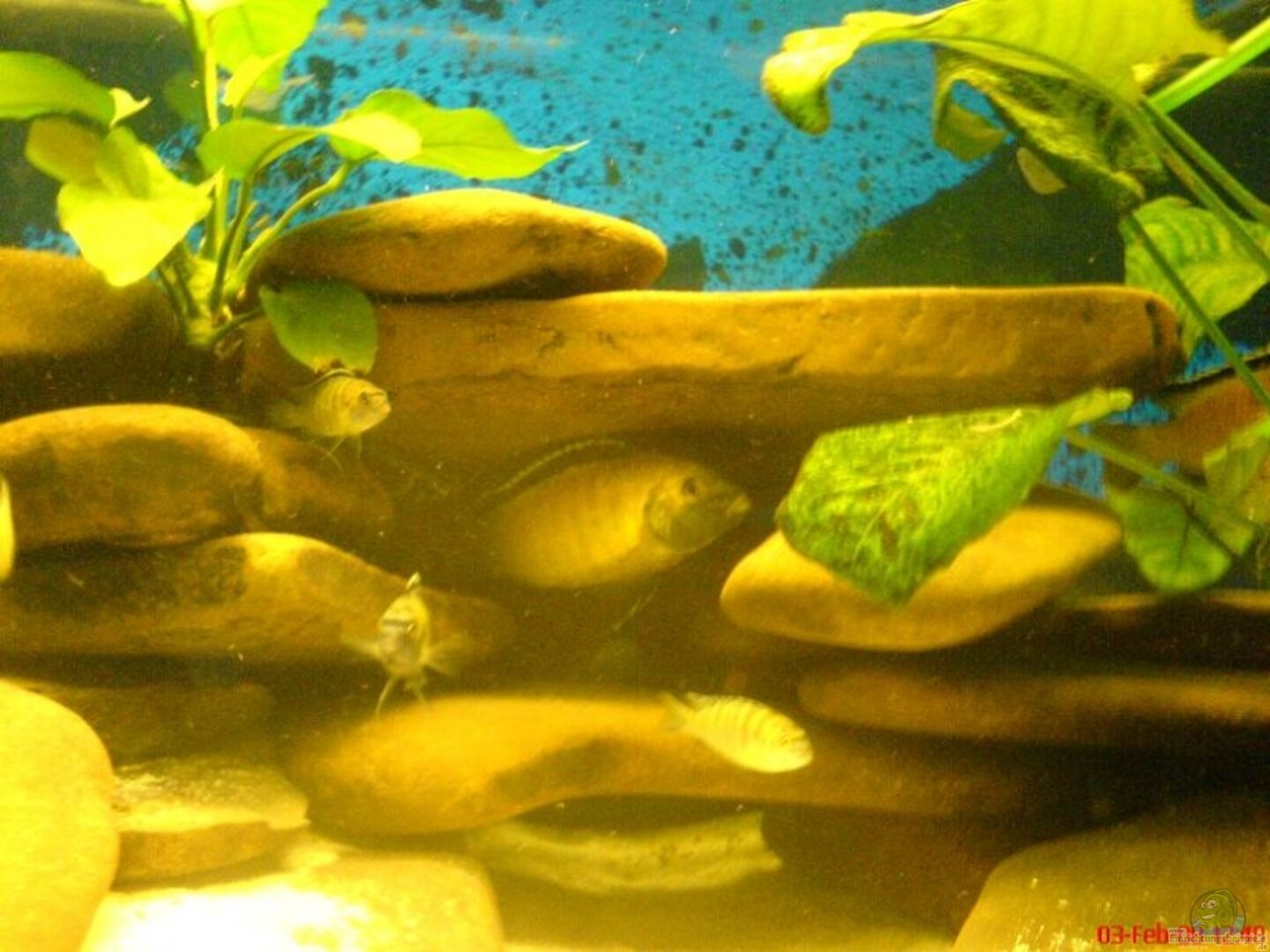 Die Steinaufbauten bestehen aus 100 kg Lochgestein. Au??erdem befinden sich in dem Becken ein Kieselstein und zwei Feuersteine. Die Hintergrundfolie ist blau, und wurde hinter die Aquarienscheibe geklebt.