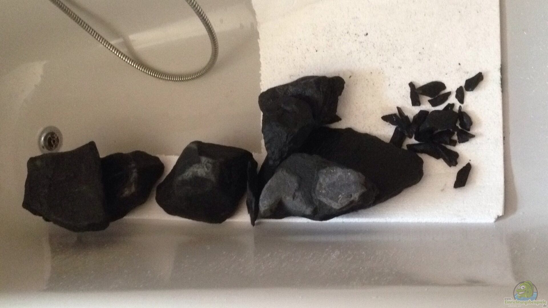 Die Rückwand, rechte Seitenwand (weil es bei mir in der Ecke steht) und der Innenfilter ist mit der Juwel Stone Granit Rückwand und Filtercover beklebt. Dunkle Steine wurden gewaschen und jewels ca 30 Minuten abgekocht, damit alles ordentlich "clean" ist fürs Aquarium und anschlie??end aufgestapelt, damit schöne viele Höhlen und Verstecke entstehen