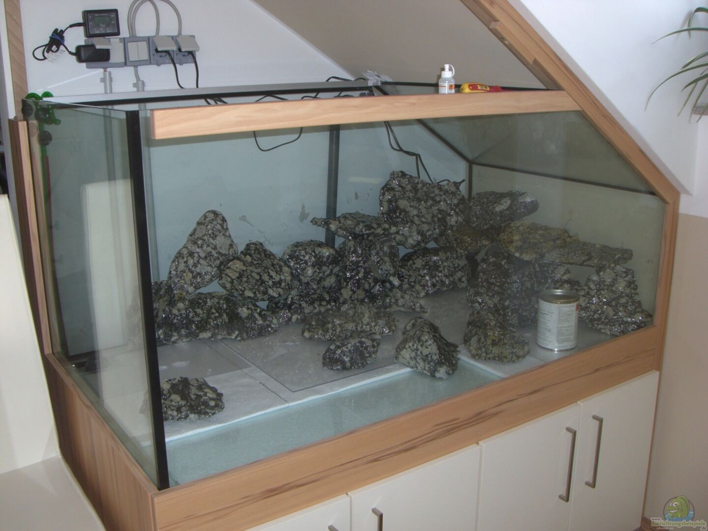 Die Rückwand besteht aus ca. 200 kg massiven Mühlviertler Granitsteinen, die ich vorher mit Epoxydharz versiegelt habe. Durch das versiegeln der Steine wurden scharfe Kanten abgerundet und die Oberfläche der Steine schön glatt. Das Problem am Granit ist, er ist verdammt schwer. Um das massive Gewicht der Rückwand gleichmässig zu verteilen, habe ich eine 1cm dicke Styroporplatte und eine 0, 5 cm dicke Plexiglasplatte untergelegt. Unbehandelter Granit nimmt aus dem Wasser viele Nährstoffe auf, [...]