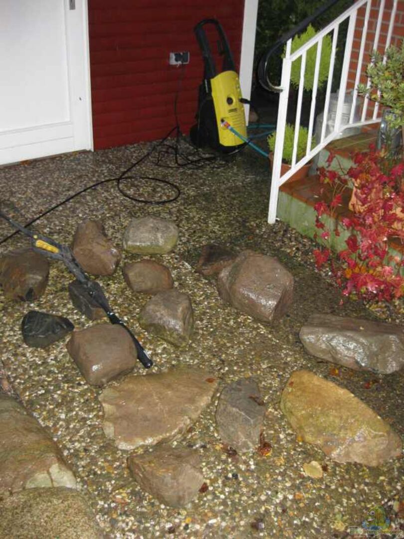 =================================================== Zum Schutz vor spitzen Steinen wurde eine 2 cm starke Styroporplatte auf die notwendigen Bereiche der Bodenplatte gelegt. Hierauf konnten ca. 300 kg gewaschene Feldsteine aus der Umgebung so platziert werden, dass sich einige Höhlen, aber auch eine gro??e Sandzone und somit genügend Schwimmraum für die verschiedenen Arten ergeben haben. Die Rückwand ist neu und besteht aus zwei selbst gefertigten Sperrholz-Kästen (Rückwand: 180 [...]