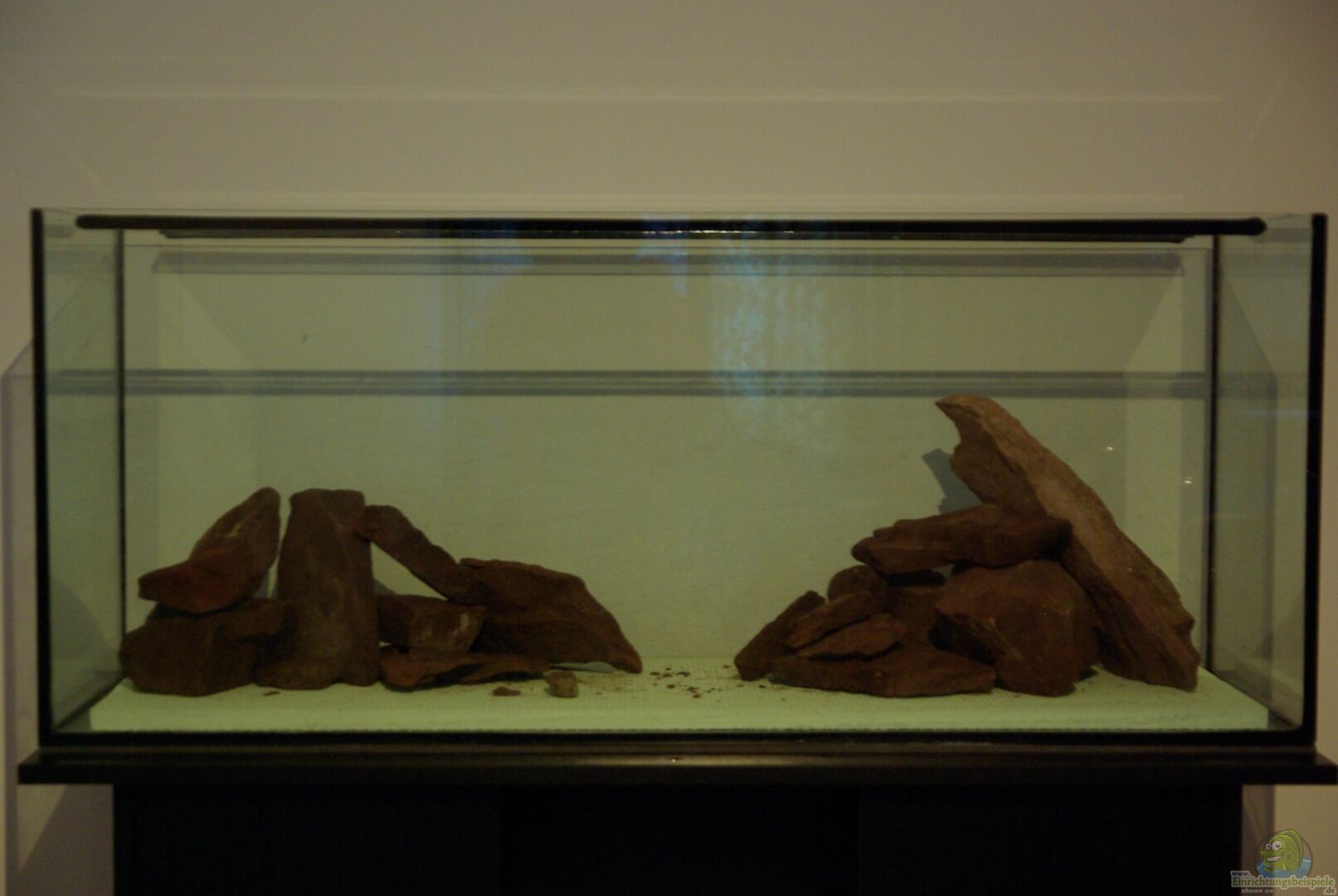 ca. 60 kg Roter Sandstein. als Unterlage dient eine 20mm Styrodurplatte. Rechts bis unter die Wasseroberfläche und mit einer Plexischeibe an der Rückwand gesichert. Die Steine reichen von der Rückwand bis ca. 5 cm vor die Frontscheibe und bilden viele Höhlen und Durchgänge, in der hinteren Ecke befindet sich der JBL Topclean Skimmer. Dieser Steinhaufen ist das Revier meines Saulosibocks, ausserdem befinden sich im hinteren Bereich auch kleinere Höhlen als Versteckmöglichkeit für [...]