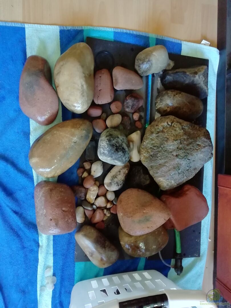 Rückwand / Folie - JUWEL Cliff Dark an der Rückscheibe, sowie die ehemalige Innnefilterverkleidung über Eck an Rück- und Seitenscheibe. - Schwarze Klebefolie von au??en an der rechten Seitenscheibe Aufbau - verschiedene grö??erer Flusskiesel und Flusssteine aus dem Rhein und Neckar, sind geschätzt etwa 25-30kg Steine - 2 Welsröhren Ton als geschlossen Höhlen - Mangrovenwurzeln, Moorkienwurzeln und Spiderwood, es sind 3 einzelne Wurzeln verbaut worden