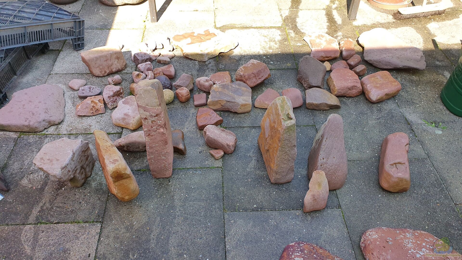 Kantengerundete Flusskiesel aus rotem Buntsandstein in verschiedenen Grö??en, ca 150 kg. Um das Gewicht zu verteilen, ist der Glasboden mit Styroporplatten und 5mm Hartplastikplatten ausgelegt. Einige Felsen stehen stabil senkrecht als Sichtschutz und Reviergrenze. 2 flache Steine links und rechts sind als Laichplatz für die Ophthalmotilapia gedacht. Zahlreiche Schneckenhäuser in verschiedenen Grö??en für Schneckencichliden. Felsmodule von Rockzolid, die mit einem Gemisch aus vermahlenem [...]
