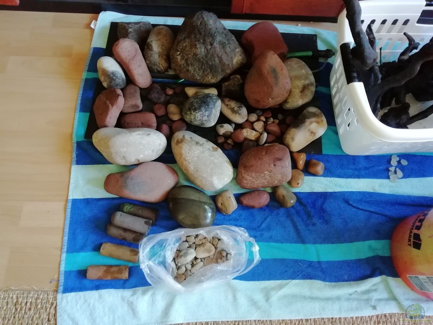 Rückwandverkleidung - JUWEL Cliff Dark - Schwarze Klebefolie - verschiedene Flusskiesel und Flusssteine aus dem Rhein und Neckar - 2 Welsröhren und 3 Welshöhlen aus Kunststoff/Ton - Mangrovenwurzeln, Moorkienwurzeln und kleine Buchenäste - verschiedens Laub (Banane, Ficus, Seemandelbaum, Eiche, Buche, Guave, Dracaena, Bambus) - Erlenzapfen
