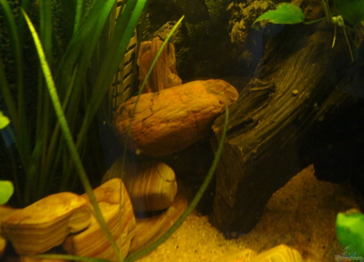 2 Wurzeln mit anubias bebunden Steinaufbau vor HMF (mit Aqua Silikon verklebt) Höhle aus Wurzel und Steinen errichtet