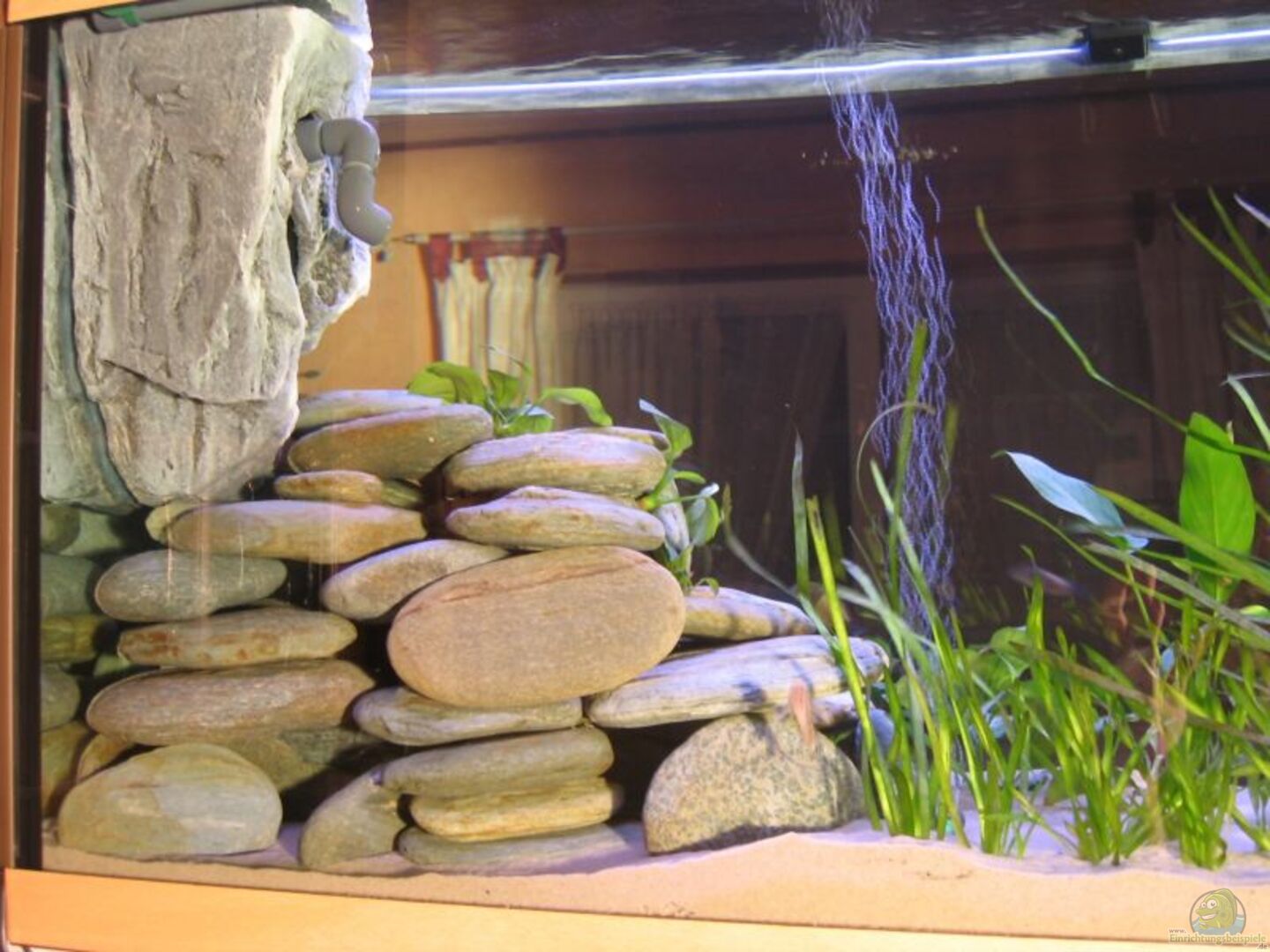 Oben rechts ein eingeklebter Felsbrocken wo die Ströhmungspumpe und Ph elektrode untergebracht sind und wenn nötig lege einfach ein Netz Nitrat stop supra oder anderes mit rein.