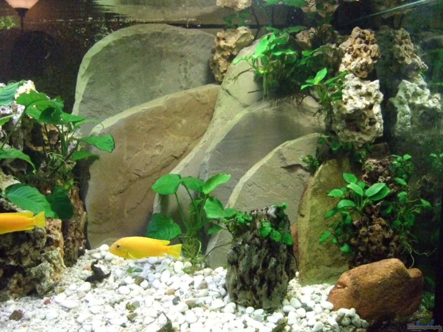 viel Lochgestein und Steinplatten (Felsaufbauten als Sichtschutz und Versteck), etwas Holz, Steinplattenrückwand (hinterschwimmbar)