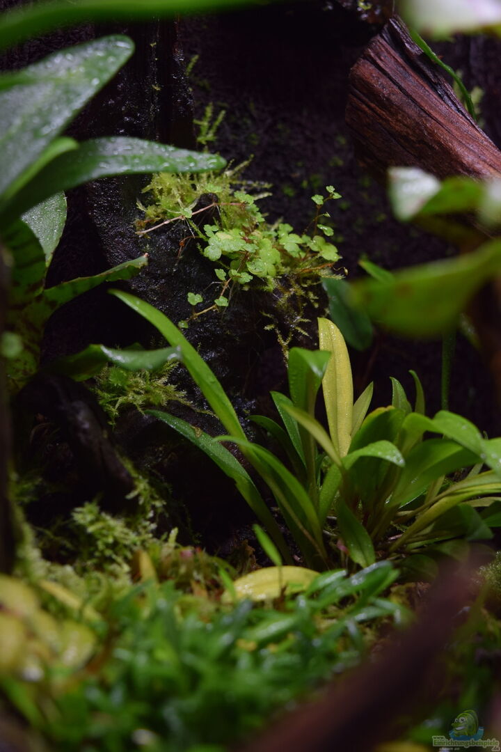 Tillandsien: Tillandsia bulboasa Ranken: Marcgravia umbellata, Begonia schulzii, Ficus spec. Borneo, Ficus quercifolia Bromelien: Neoregelia Alley Cat x pauciflora, Neoreglia Akeso, Cryptanthus microglazoui, Farne und Bodendecker: Taxiphyllum Spiky, Chirita tamiana, Hydrocotyle tripartia Mini Orchideen: Stelis ssp., Pleurothalis sonderana,