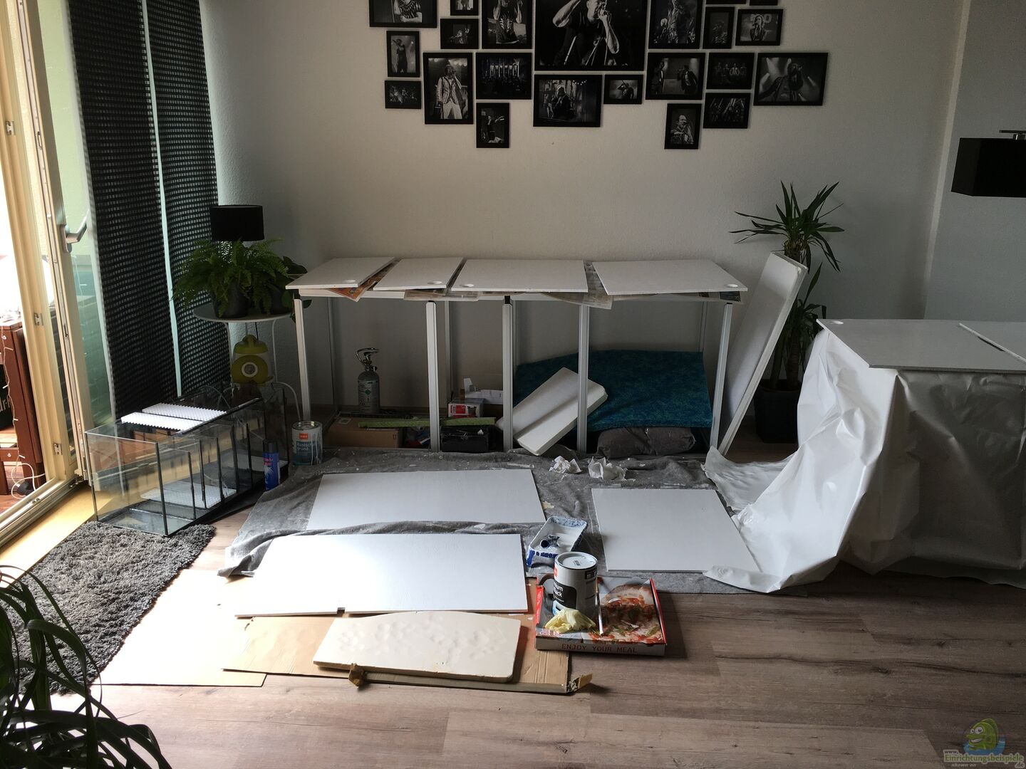 Ma??anfertigung in 10mm Glas, ??berlaufschacht und vier Bohrungen (drei für Filterschacht und eine au??erhalb des Schachtes für Wasserwechsel) Unterbau wurde aus Aluprofilen von MarineSystems gebaut, darunter und darauf eine 3cm Schalungsplatte und Styropor zur Lastverteilung. Verkleidet wurde das Becken durch Möbelbauplatten Die Abdeckung wurde von einem Aquarienbauer auf Ma?? gefertigt.