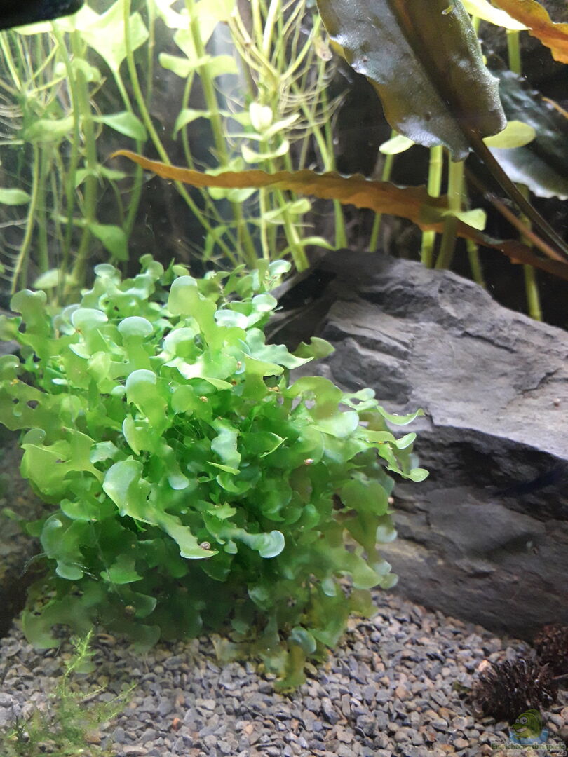 Rechts im Hintergrund wiegen sich Riesenvalisnerien in der sanften Strömung, die sich sanft über die Oberfläche legen und das Becken dort schön schummrig wirken lassen. Javafarn scheint aus einer zentral platzierten Wurzel zu spriessen. Daneben dienen zwei Cryptocoryne wendtii brown auch mal als grossblättrige Pflanze zum ausruhen oder als Schneckenrutsche. Aufgebunden auf den Wurzelspitzen finden sich Weepingmoos, Bucephalandra(Wavy Leaf) und Anubias barteri nanaPangolino. Links im Hintergrund [...]