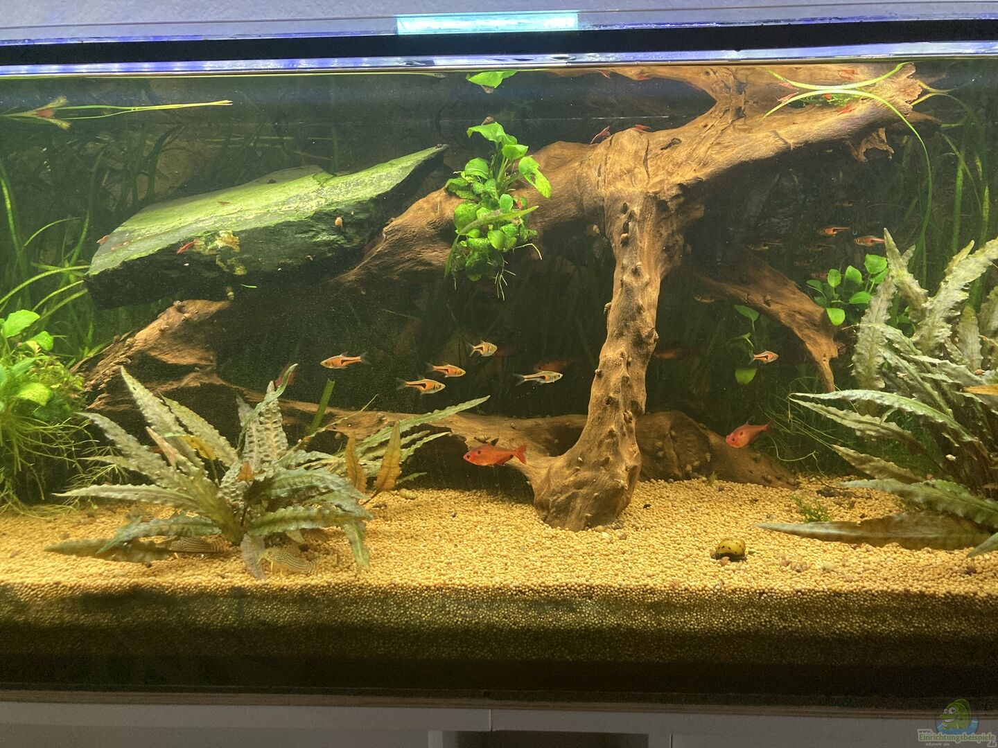 3 marmorierte Fadenfische (Trichogaster trichopterus). 2x Blau und 1x Gold. Das goldene Weibchen ist leider verstorben. 12 Blutsalmler (Hyphessobrycon eques) 20 Espes Keilfleckbärblinge (Trigonostigma espei) 13 Orangeflossenpanzerwels (Corydoras sterbai) 5 Metallpanzerwelse (Corydoras aeneus) - aus altem Aq übernommen 8 Ohrgitterharnischwelse(Otocinclus affinis) 4 Panaqolus cf. maccus "L 104" viele Turmdeckelschnecken etwa 8 Rennschnecken viele Red fire Garnelen (Neocaridina [...]
