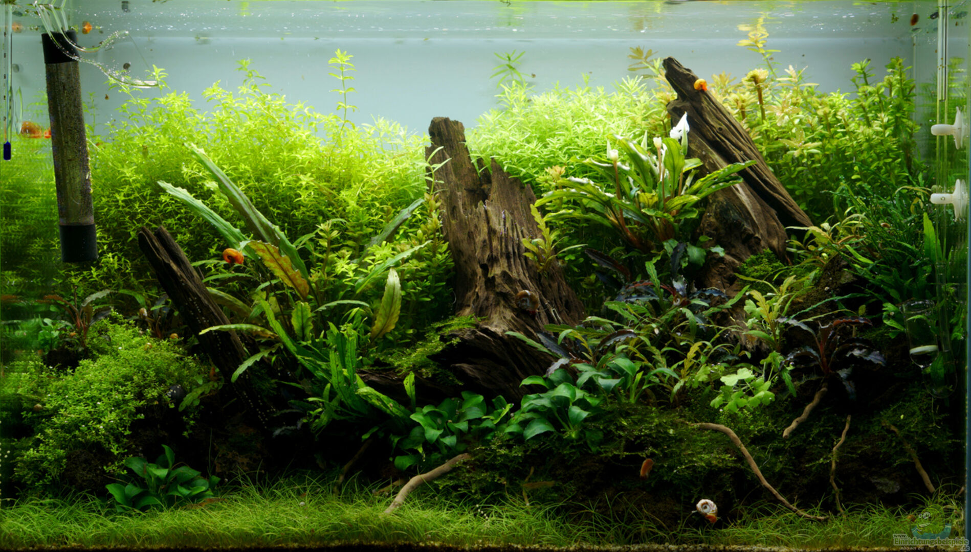 Es handelt sich um ein transparent verklebtes Glasgarten-Aquarium aus einfachem Floatglas. Die Rückwand ist mit Milchglasfolie beklebt. Ich habe das Becken in der Rubrik Aquascaping eingeordnet, obwohl es nicht wirklich eine Landschaft darstellen soll. Soll eher ein Versuch in Richtung "Naturaquarium" sein. Letztendlich ist es aber ja aber aauch völlig egal wie man es nennt...