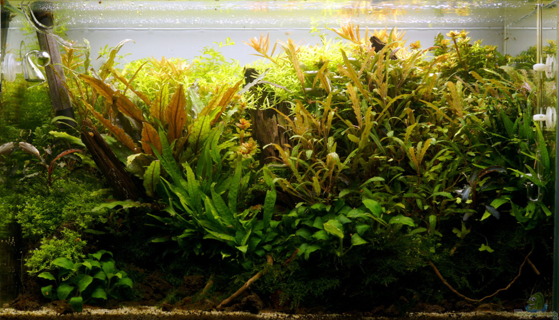 Es handelt sich um ein transparent verklebtes Glasgarten-Aquarium aus einfachem Floatglas. Die Rückwand ist mit Milchglasfolie beklebt. Ich habe das Becken in der Rubrik Aquascaping eingeordnet, obwohl es nicht wirklich eine Landschaft darstellen soll. Soll eher ein Versuch in Richtung "Naturaquarium" sein. Letztendlich ist es aber ja aber aauch völlig egal wie man es nennt...