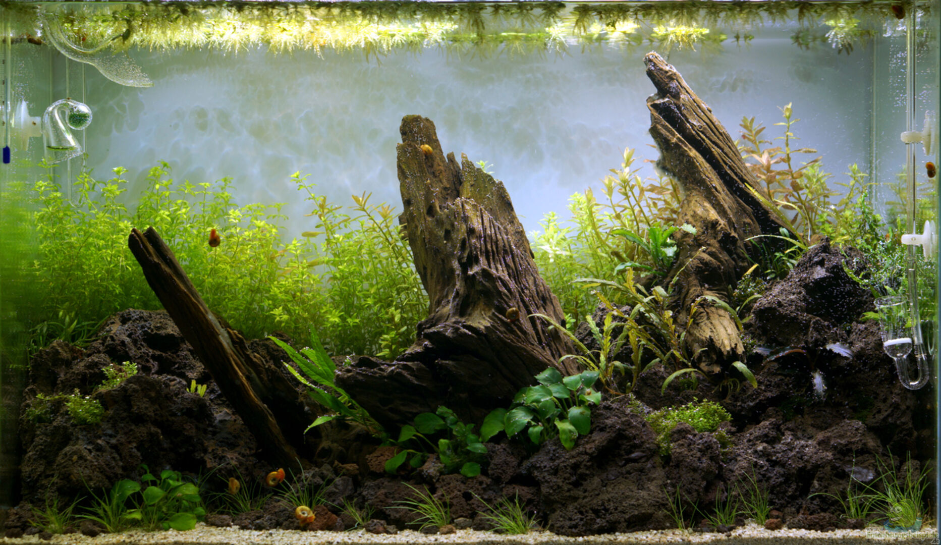 Es handelt sich um ein transparent verklebtes Glasgarten-Aquarium aus einfachem Floatglas. Die Rückwand ist mit Milchglasfolie beklebt. Ich habe das Becken in der Rubrik Aquascaping eingeordnet, obwohl es nicht wirklich eine Landschaft darstellen soll. Soll eher ein Versuch in Richtung "Naturaquarium" sein. Letztendlich ist es aber ja aber aauch völlig egal wie man es nennt...