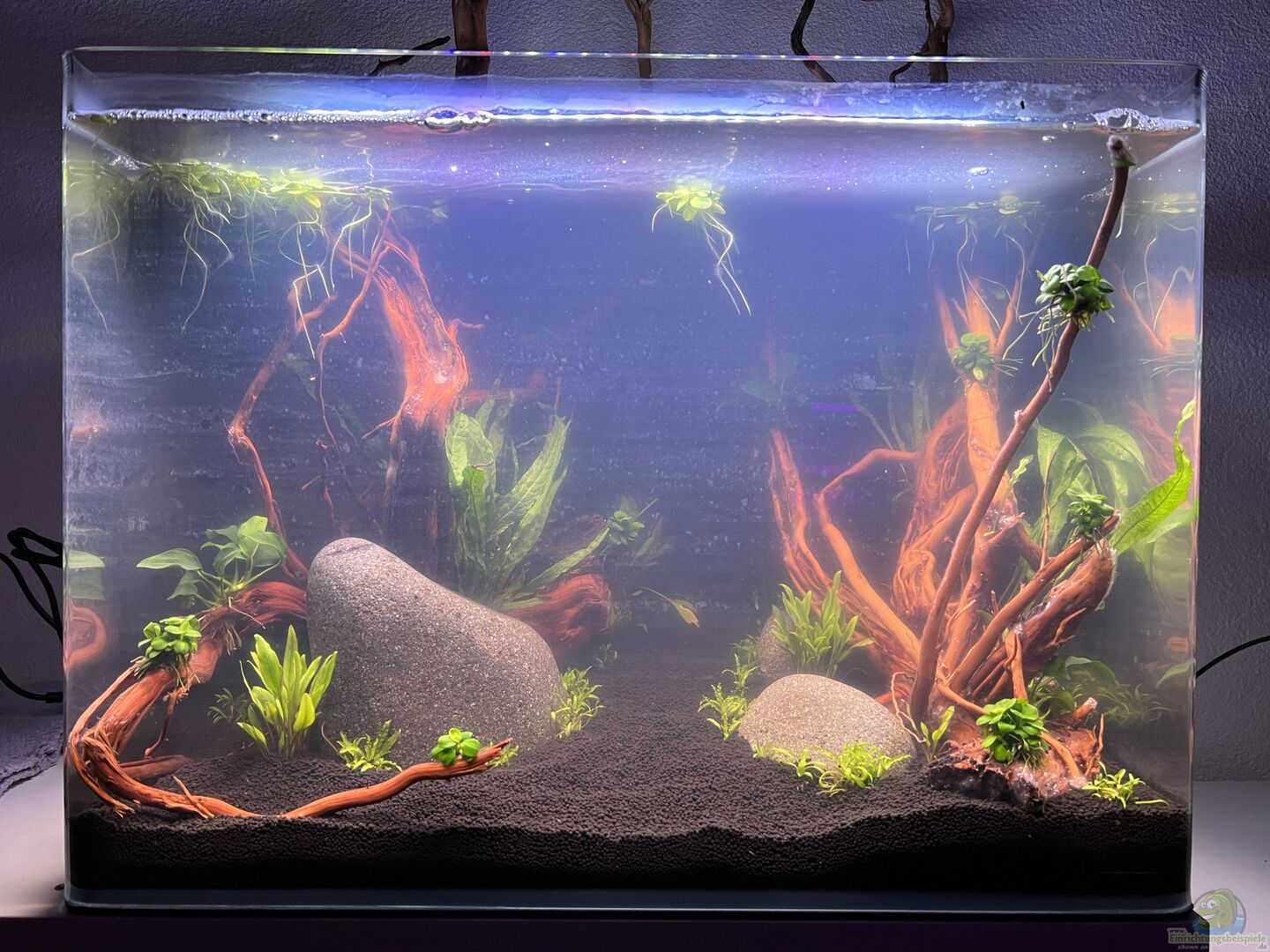 Weissglas-Becken von Dennerle (Nano Tank 70l) wird ohne GlasAbdeckung betrieben, das Holz-Hardscape (Wurzel) von Amtra Dragon Skin steht oben einige cm heraus. Als Schattenspender dient eine Schwimmpflanzendecke Schwarze selbstklebende Rückwandfolie Die Einrichtung selbst wurde nicht mit Fotos begleitet, da mein erstes Becken