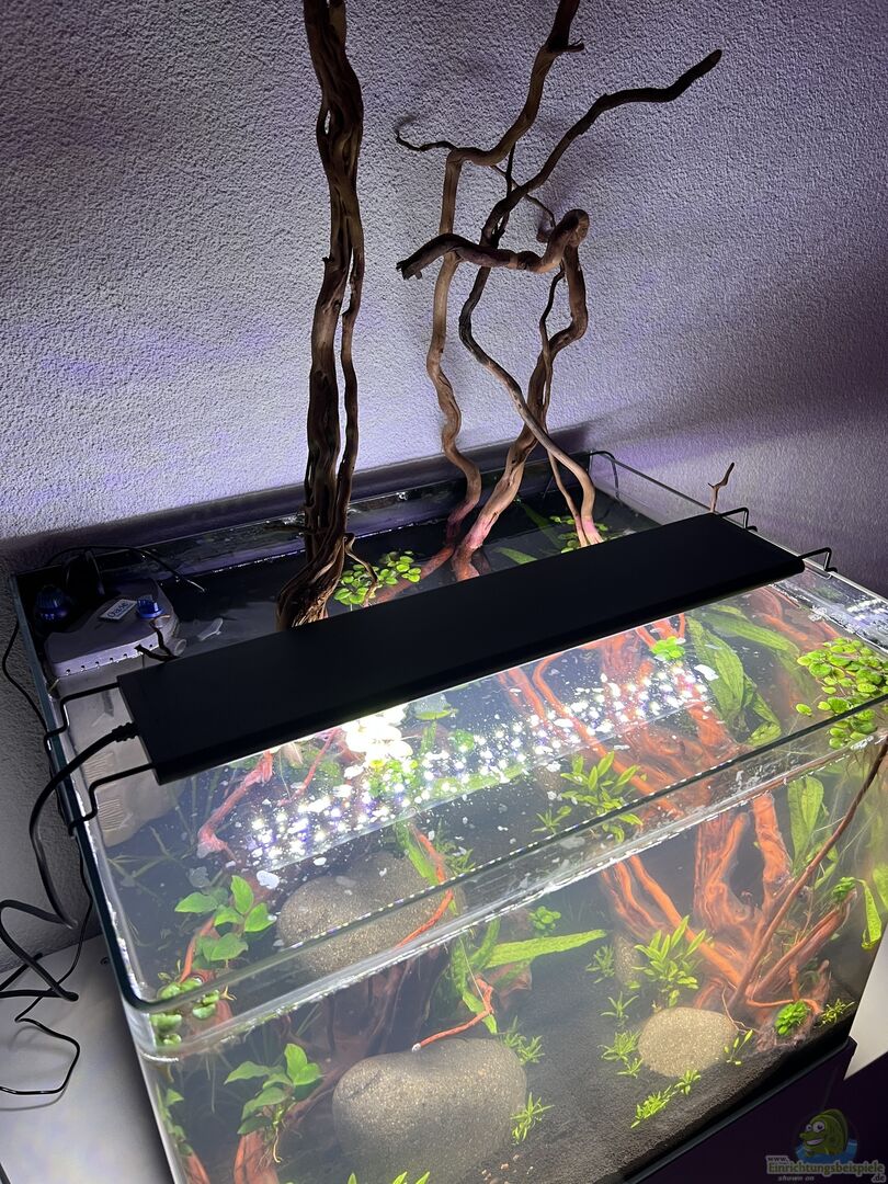 Weissglas-Becken von Dennerle (Nano Tank 70l) wird ohne GlasAbdeckung betrieben, das Holz-Hardscape (Wurzel) von Amtra Dragon Skin steht oben einige cm heraus. Als Schattenspender dient eine Schwimmpflanzendecke Schwarze selbstklebende Rückwandfolie Die Einrichtung selbst wurde nicht mit Fotos begleitet, da mein erstes Becken
