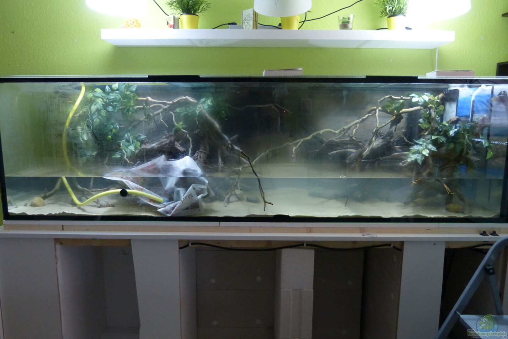 - selbstgebaute Rückwand in Stein/Felsoptik au??erhalb des Beckens - Moorkienwurzeln in verschieden Grö??en von XL - XXXL - Korkenzieherhaselnussäste von oben ins Becken gehangen - künstliche Terrarien Pflanzen von Exo Terra * 2 x Exo Terra Ficus (ca.70cm) * 2 x Exo Terra Ficus (ca.45cm) - Seemandelbaumblätter - Erlenzapfen * Die Seemandelbaumblätter werden alle 2 Wochen ausgetauscht und von den Erlenzapfen wird wöchentlich etwas selbstgemachter Tee ins Becken [...]