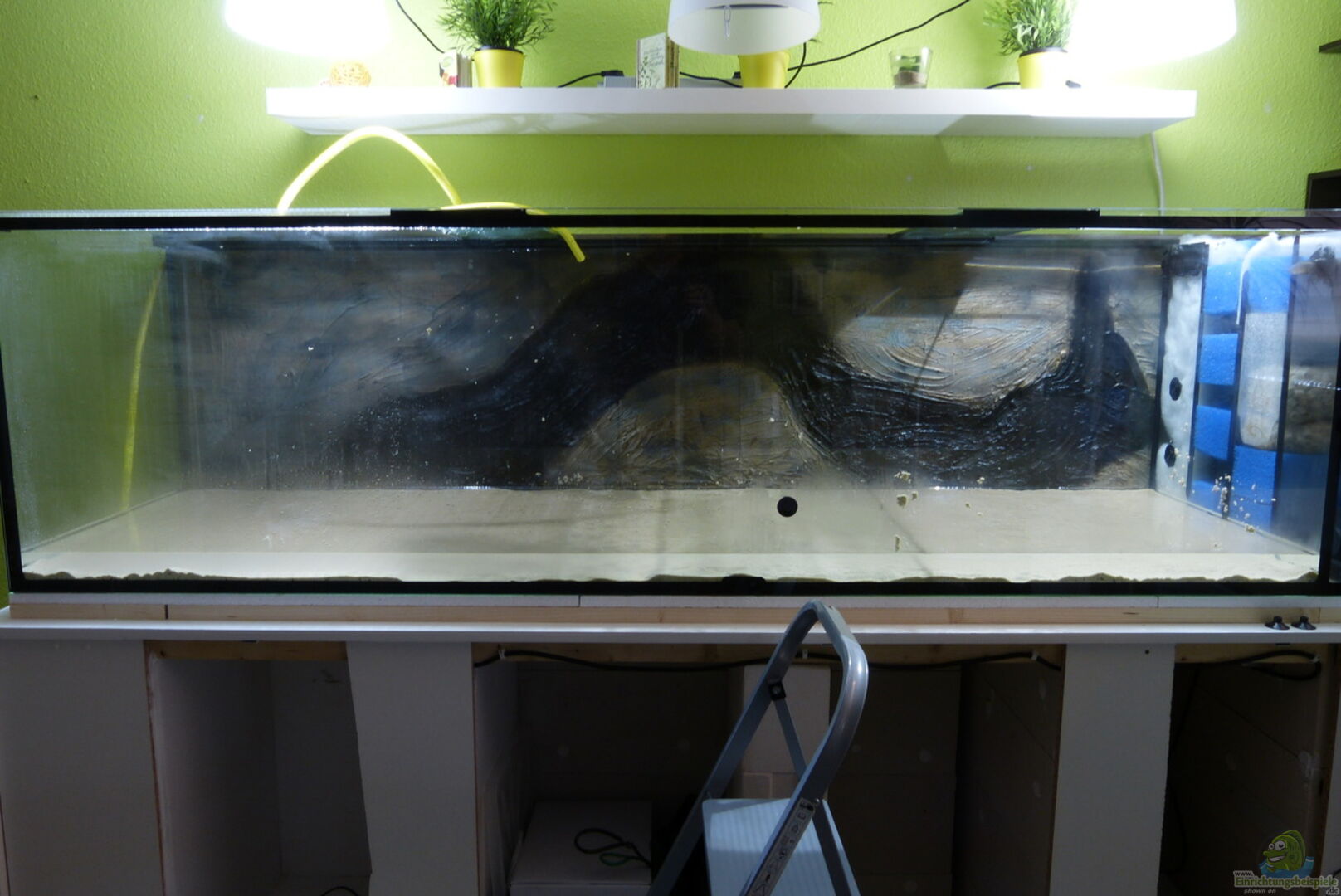 - selbstgebaute Rückwand in Stein/Felsoptik au??erhalb des Beckens - Moorkienwurzeln in verschieden Grö??en von XL - XXXL - Korkenzieherhaselnussäste von oben ins Becken gehangen - künstliche Terrarien Pflanzen von Exo Terra * 2 x Exo Terra Ficus (ca.70cm) * 2 x Exo Terra Ficus (ca.45cm) - Seemandelbaumblätter - Erlenzapfen * Die Seemandelbaumblätter werden alle 2 Wochen ausgetauscht und von den Erlenzapfen wird wöchentlich etwas selbstgemachter Tee ins Becken [...]