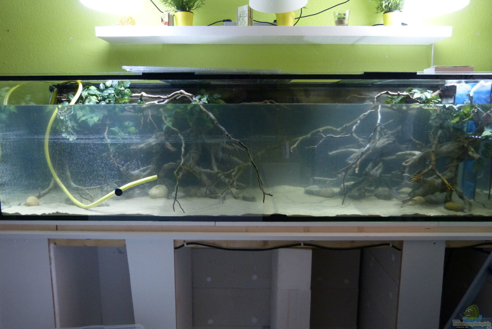 - selbstgebaute Rückwand in Stein/Felsoptik au??erhalb des Beckens - Moorkienwurzeln in verschieden Grö??en von XL - XXXL - Korkenzieherhaselnussäste von oben ins Becken gehangen - künstliche Terrarien Pflanzen von Exo Terra * 2 x Exo Terra Ficus (ca.70cm) * 2 x Exo Terra Ficus (ca.45cm) - Seemandelbaumblätter - Erlenzapfen * Die Seemandelbaumblätter werden alle 2 Wochen ausgetauscht und von den Erlenzapfen wird wöchentlich etwas selbstgemachter Tee ins Becken [...]