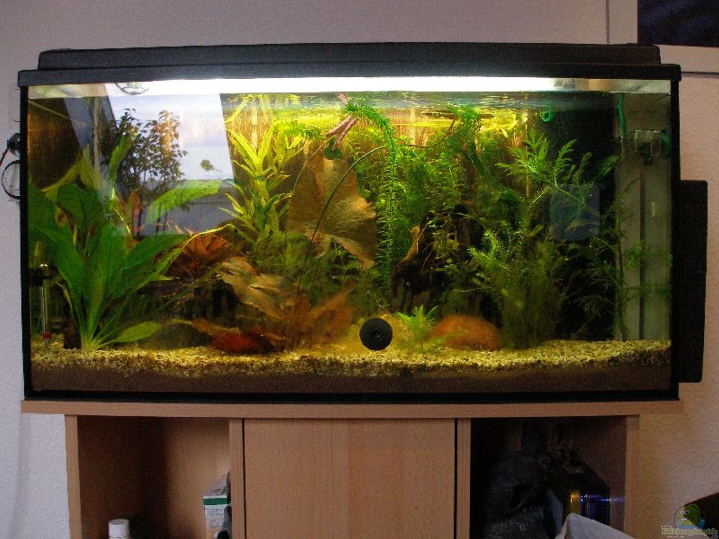 ehemals Starterset von MP, bei dem nun in einem neuen Glasbecken ein komplett neuer Ansatz gemacht wird, um die Reste der Mooskugeln los zu werden. Gleichzeitig steige ich von Au??enfilter auf Mattenfilter um. Unterschrank Buche hell von MP (ersetzt alten IKEA-Schrank)
