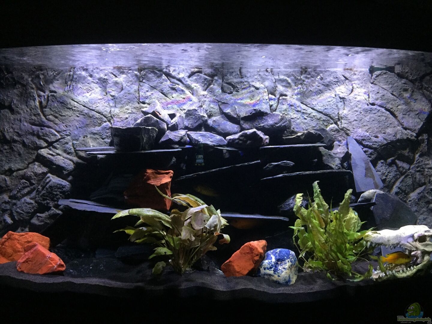Das Aquarium besitzt eine gewölbte Frontscheibe. In den Bodengrund ist eine 1cm Styroporplatte ( ca. 1 cm kleiner als das Aquarium) eingearbeitet.