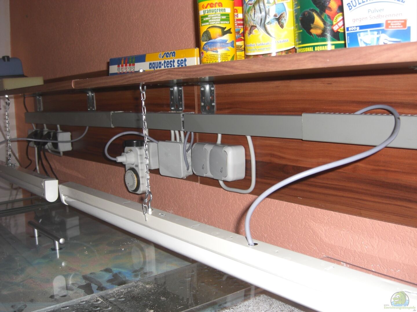 Da mich bei meinem Vorgängerbecken der Kabel-Wust aus unzähligen 3er- und 5er Steckdosenleisten, die hinter und unter dem Becken verstreut lagen, gestört haben, wollte ich es diesmal besser machen und habe ein "Technik-Board" gebaut. Ein einfaches Regal über dem Becken auf dem 10 Steckdosen ihren Platz fanden und an dem auch die Beleuchtung aufgehangen ist. Au??erdem steht auf dem Board die Luftpumpe, das hei??t sie stehen oberhalb des Beckens, deswegen kann auf Rückschlagventile [...]