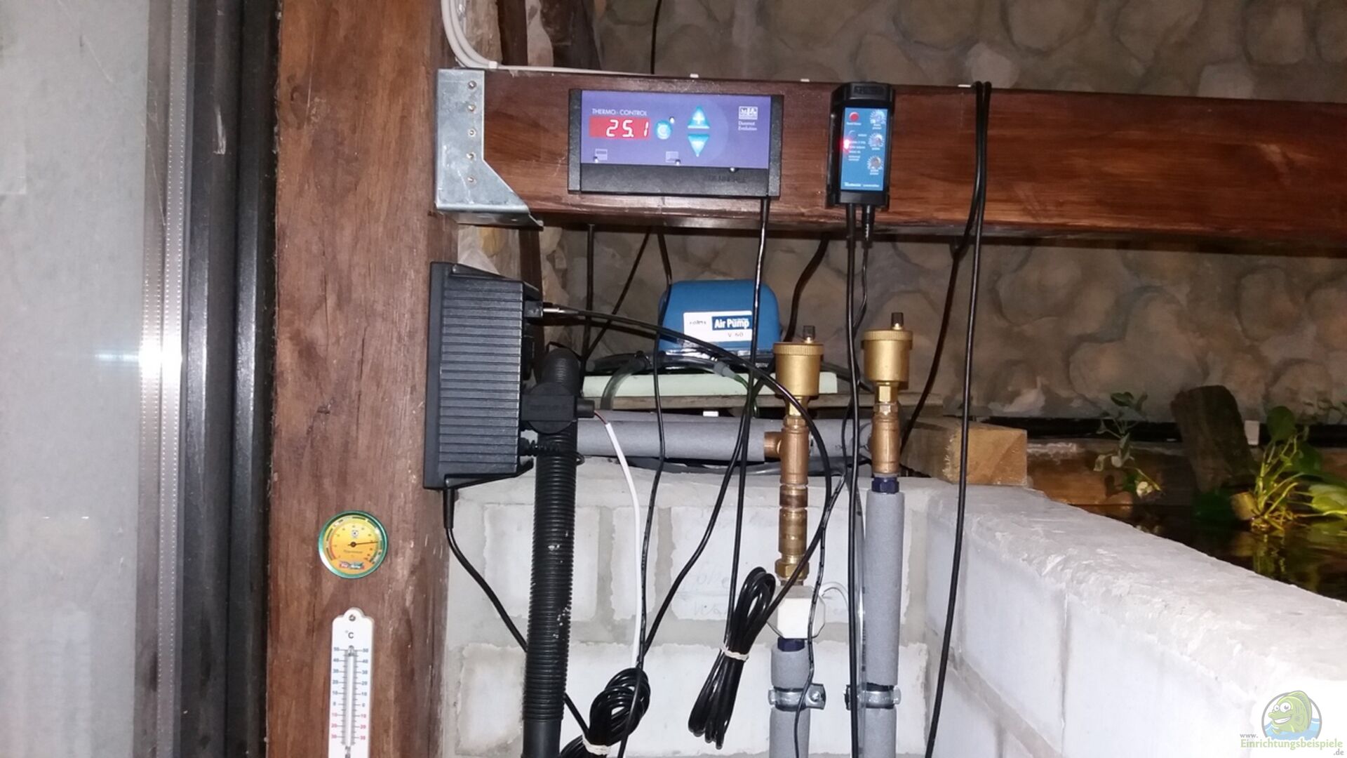 Heizung: Dennerle Duomat Evolution Edelstahlheizspirale Elektrothermischer Stellantrieb (stromlos geschlossen) Das Ganze ist an die Zentralheizung angeschlossen, welche mit Holzhackschnitzel betrieben wird, somit ist es sehr kostengünstig. Wasserwechsel: Regenwasser wird in einem IBC-Container gesammelt und mit einer Pumpe durch einen Hauswasserfilter (doppel) ins Aquarium gepumpt. Ein angeschlossenes Abflussrohr verhindert das ??berlaufen des Wasser-Container.