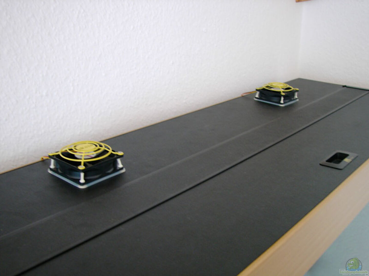 Strömungspumpe mit 800L/h hiter der Rückwand sorgt für ein wnig Strömung, Bio Co² Anlage Marke Eigenbau mit Lindenholzausströmer, 2 Lüfter die warme Luft vom Aquarium absaugen um die Kondensatbildung an der Abdeckung zu verhindern, Jäger Regelheizer 150W