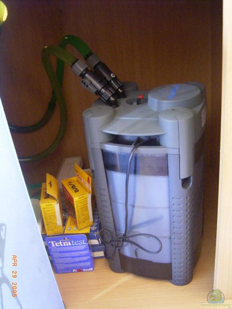 Vor dem Eheimfilter ist ein UV-C Klärer geschaltet. Beheizt wird das Becken über eine 100 Watt Bodenheizung die gesteuert wird über dem Duomaten 1200 von Dennerle und einer 300 Watt Stabheizung. Au??erdem sind im Becken noch zwei Ausströmsteine der Membranpumpe mit je 120 ltr./ min