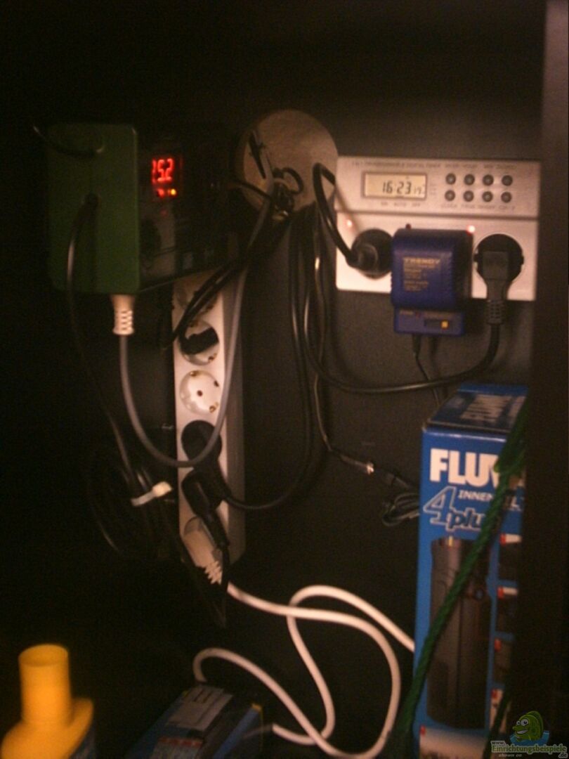 1.Bodenfluter von Aqua-Thermo (Verwendung als biolog. Filter) + Heizstab von Tetra (150W). Beides wird ueber den Dennerle Duomat 1200 comfort auf 25, 0 Grad gesteuert. 2.Nitratfilter der Firma Ratz