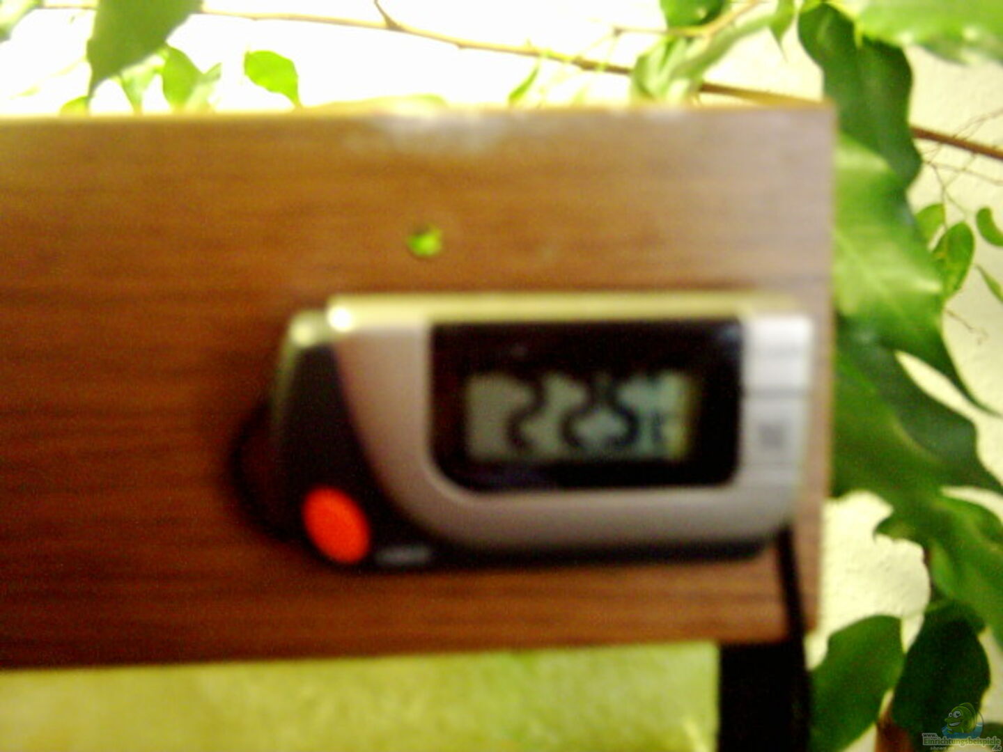 Co2 Anlage! Eine einfache ohne Flasche, da einfach zu wenig Pflanzen im Becken sind, lohnt es sich nicht eine zu besorgen. Es steht ein kleiner Behälter im Unterschrank, indem man alle 30 Tage bestimmte Chemikalien reinstreut und gären lä??t. Ganz einfach zu Handhaben. Digitales Thermometer. Zeigt Innen- und Aussentemperatur.