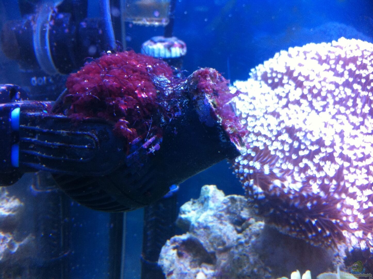 Tunze 9004 Abschäumer Sicce 2000 Strömungspumpe (2000L/h), läuft alle 2 Std für 2 Std über eine Zeitschaltuhr an (Wechselströmung) Tunze 6045 flow control Strömungspumpe (auf minimum gedrosselt) JBL Heizer 100W Aqua Light Wassernachfüllanlage Eheim Skim (zur zusätzlichen Oberflächen Absaugung), läuft gedrosselt. Der Schwamm wird 1-2x in der Woche gesäubert/gespült.
