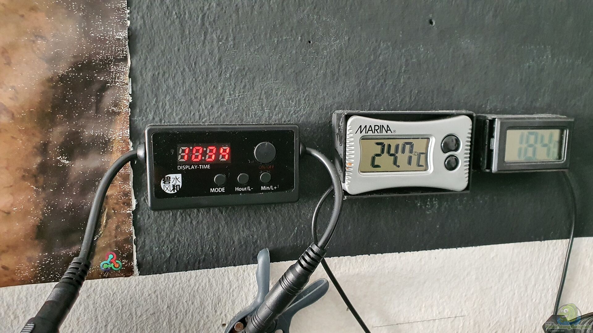 Eheim Heizstab 300 Watt (wurde mit Plastikwinkeln und Kabelbindern schwarz verkleidet, passend zur schwarzen Rückwand und der Verrohrung), Eheim 400 Luftpumpe - 400 l/h - 4 Watt, Strömungspumpe SunSun JVP-202AB mit Magnethalter - 12000l/h - 24W (läuft meist nur kurz damit die auch einmal Gas geben können, wäre auf Dauer natürlich purer Stress!), JBL Cooler 300 - 6 Ventilatoren - 15, 3 Watt und dazu JBL Cool Control, 2 Stück Tisch/Wandventilatoren von Honeywell mit je 40 Watt (zur [...]